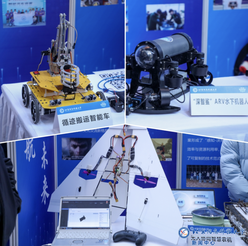 在科创项目风采区,56项北京信息科技大学学生在“挑战杯”“国创赛”等重大赛事中获奖的顶尖科创成果一一陈列。自动化学院(人工智能学院)“深智鲨”小型无人潜航器、信通学院基于AI的精准气象云图预测系统、理学院垂起固定翼无人机等创新展品人气颇高。值得一提的是,计算机学院“语绘视界”项目团队研发的基于AI智能体与图神经网络门控机制的智能助盲系统,相关设备已在北京市盲人学校、康复医院等场景完成试点应用,并刚荣获第十九届“挑战杯”全国大学生课外学术科技作品竞赛主体赛一等奖。