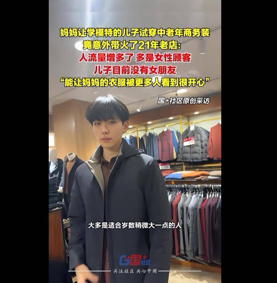 近日,山东一经营服装店的妈妈,让学服装表演的儿子帮忙试穿店内中老年商务装,意外在网上走红,带火了经营21年的老店。
