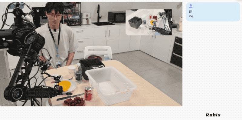 而Robix本身也并不是多个模块拼合的散装大脑,而是一个视觉-语言融合的单模型,能同时处理画面、语言,还能把思考过程、动作指令、人类回复整合在一个逻辑循环里,避免模块间沟通卡顿。